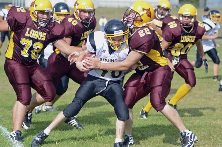 Derek Buffum (22) wraps up a Clallam Bay Bruin runner while Mike Hobi (72), Tommy Kramer (40) and Keldon Jardine (80) move in to assist.