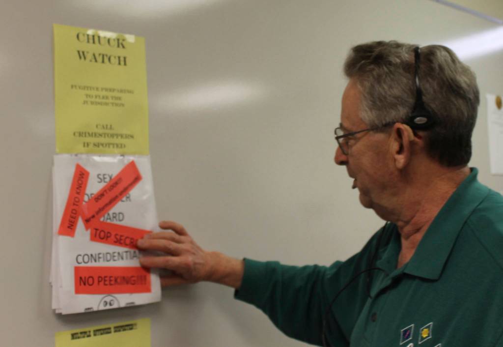 McCarty posts “Chuck Watch” signs to mimic most-wanted posters in the main part of the sheriff’s office. In one, he holds another officer hostage with a detonator aimed at his head; in another, he wears a tinfoil hat while answering calls for “cyber security.”