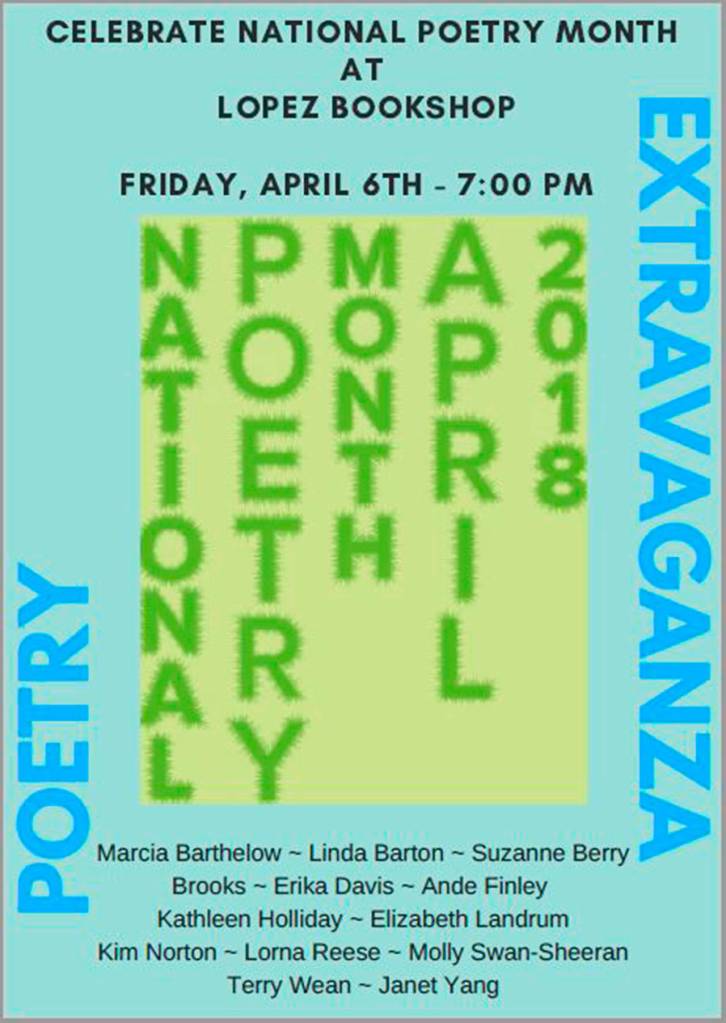 What better way to celebrate National Poetry Month than by listening to friends and neighbors reading their original poetry? That’s just how Lopez Bookshop will celebrate poets and their craft at 7 p.m. on Friday, April 6. Thirteen Lopez poets will read at what the bookshop is calling a “Poetry Extravaganza.”