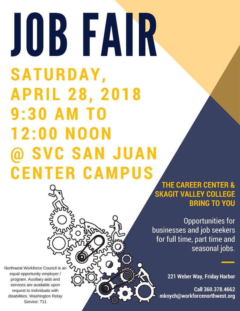 The Career Center and Skagit Valley College are sponsoring a free job fair from 9:30 a.m. to 1 p.m. on Saturday, April 28 at Skagit Valley College, 225 Weber Way, in Friday Harbor.