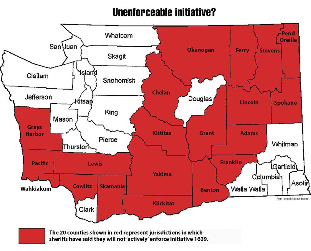 He was pleased with the announcements of Klickitat County Sheriff Bob Songer, Pacific County Sheriff Robin Souvenir, Gray Harbor County Rick Scott, Grant County Sheriff Tom Jones, Lincoln County Sheriff Wade Magers and Kittitas County Sheriff Gene Dana that they would not enforce I-1639 laws.
