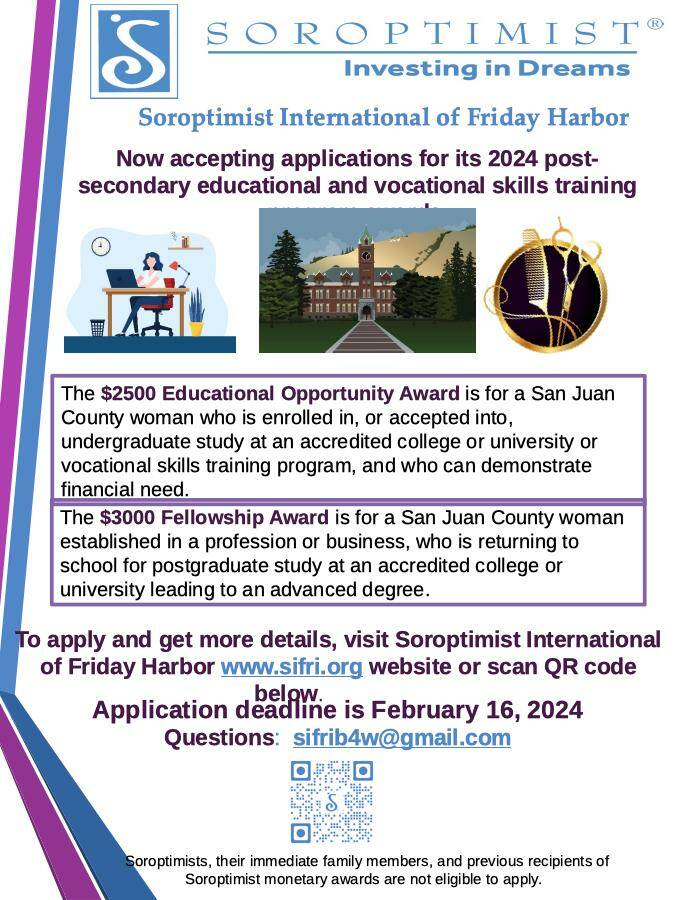 Soroptimist International of Friday Harbor currently has two post-secondary educational awards available to San Juan County women.