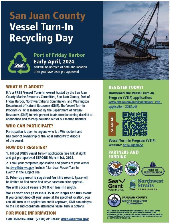 Has your ‘dream boat’ become a ‘nightmare?’ You might qualify to dispose of your old boat in a FREE Vessel Turn-In event hosted by the San Juan County Derelict Vessel Program, San Juan County Marine Resources Committee, Port of Friday Harbor, Northwest Straits Commission, and Washington Department of Natural Resources. The Vessel Turn-In Program is managed by the DNR to help prevent boats from becoming derelict or abandoned and to keep pollution out of our marine habitats. vessel turn-in