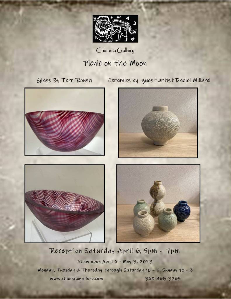 Chimera Gallery invites you to an opening reception for “Picnic on the Moon” on Saturday, April 6, from 5 to 7 p.m. The exhibit features glass by Terri Roush and ceramics by Daniel Millard.