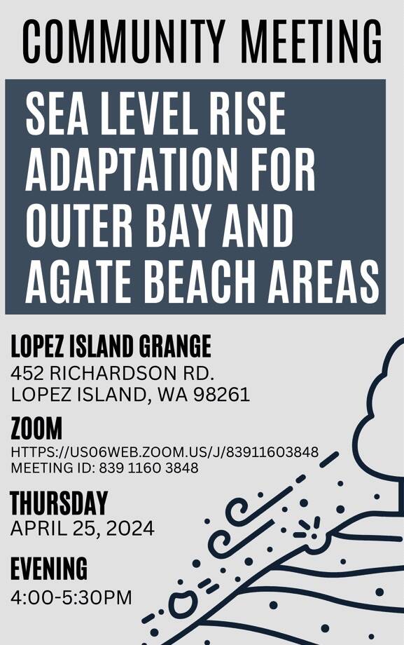 Property owners in the MacKaye Harbor area, and anyone interested in sea level rise adaptation projects, are encouraged to attend the community meeting. We thank you for your time and any feedback you can provide. Learn more about the project here: https://engage.sanjuancountywa.gov/sea-level-rise-adaptation-outer-bay-and-agate-beach-areas-lopez-island