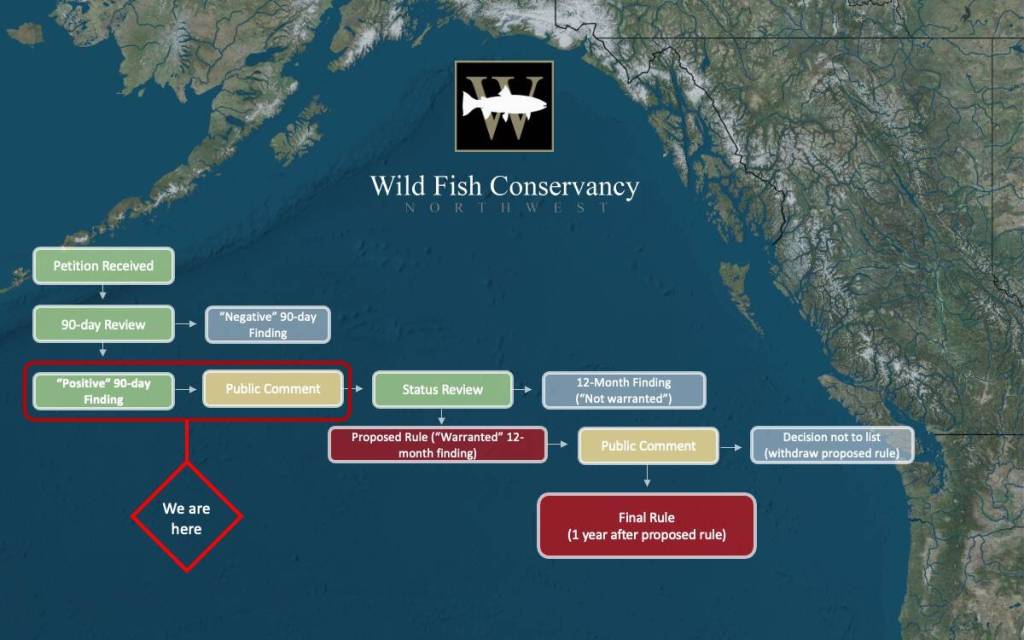 Nick Gayeski, Senior Ecologist with Wild Fish Conservancy and petition author said, “This is an encouraging first step in what we hope will be a listing of Southeast Alaska Chinook under the Endangered Species Act. Listing should provide the many at-risk chinook populations in this region stronger protection from harms in the near-term and initiate the development of scientifically credible recovery plans.”