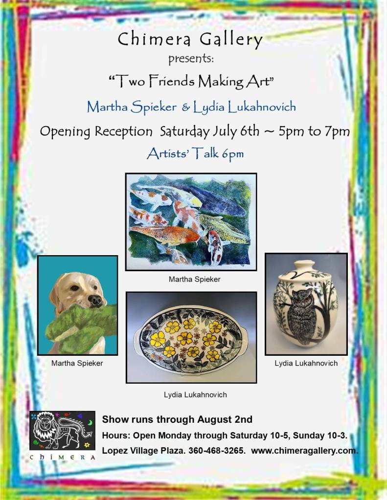 Chimera Cooperative Gallery invites you to an Opening reception for “Two Friends Making Art,” Saturday, July 6 from 5 pm to 7 pm featuring the works of Martha Spieker and Lydia Lukahnovich. Chimera Cooperative Gallery is located in Lopez Village Plaza. Call 360-468-3265 or visit www.ChimeraGallery.com for more information. In July, the Gallery is open Monday through Saturday, from 10 am to 5 pm, and Sunday, from 10 am to 3 pm.