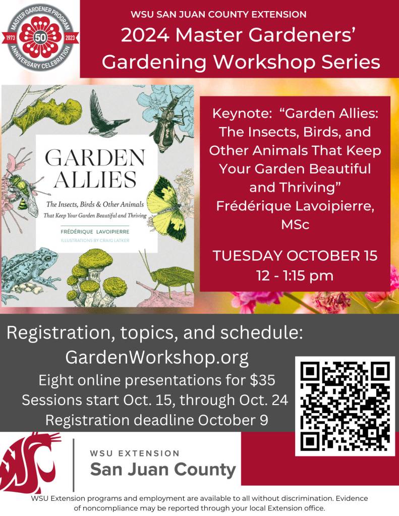 This year, the popular and informative San Juan County WSU Master Gardeners Annual Gardening Workshop Series will again take place via Zoom. Eight live one-hour webinars will be held on Tuesday and Thursdays afternoons from October 15-24. All those registered will be able to view (or review) recordings of all the presentations at their leisure for a full month.
