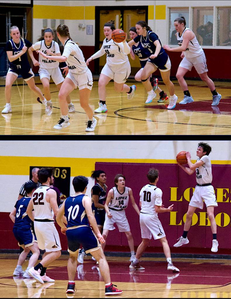 Top, left to right: Glory Westervelt, Iris Ervin-McLean, Betty Burt (with ball) and Dani Arnot take off on a fast break against Cedar Park Christian. The Lobos won 33—24. Bottom, left to right: Tristan Buckallew (22), Jake Jonas (14) and Ethan Patrick (10) look on as Silas Gronley brings down a rebound against Cedar Park in the Lobos’ 59-43 victory at home.