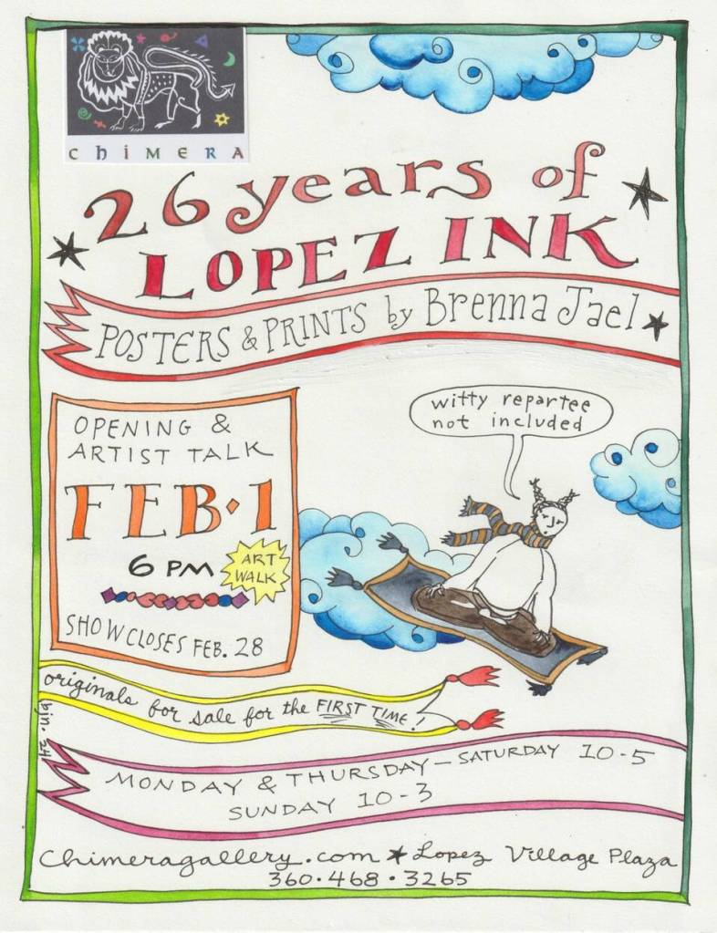 Saturday, Feb. 1, from 5-7 p.m., Chimera Gallery invites you to an Opening Reception for “26 Years of Lopez Ink” featuring Brenna Jael. Chimera Cooperative Gallery, Lopez Village Plaza, 360-468-3265. www.ChimeraGallery.com. February hours: Open Monday, Thursday through Saturday 10 a.m.-5 p.m., Sunday 10 a.m.-3 p.m.