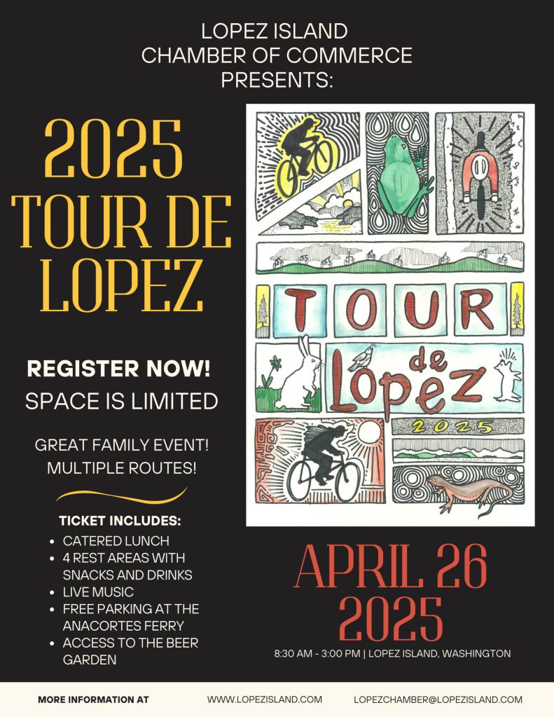 The Lopez Island Chamber of Commerce is excited to host the 19th Annual Tour de Lopez on Saturday, April 26. Whether you’re a seasoned cyclist or just looking for a fun, family-friendly outing, this non-competitive ride is the perfect way to explore the stunning landscapes of Lopez Island.