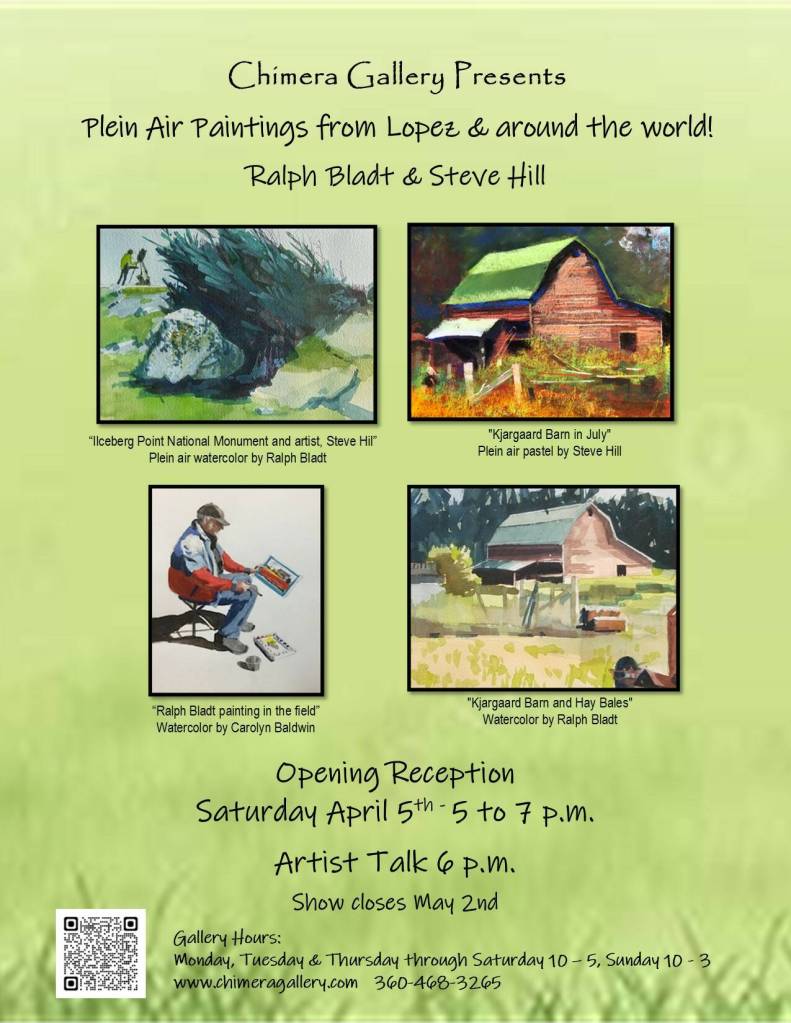 Saturday, April 5, from 5-7 p.m., Chimera Gallery invites you to an Opening Reception for “Plein Air Paintings from Lopez” with Ralph Bladt and Steve Hill. Chimera Cooperative Gallery is located at Lopez Village Plaza and can be reached at 360-468-3265. Visit www.ChimeraGallery.com for more information. April hours are Monday, Tuesday and Thursday through Saturday 10 a.m. to 5 p.m., and Sunday 10 a.m. to 3 p.m. Chimera is closed on Wednesdays.