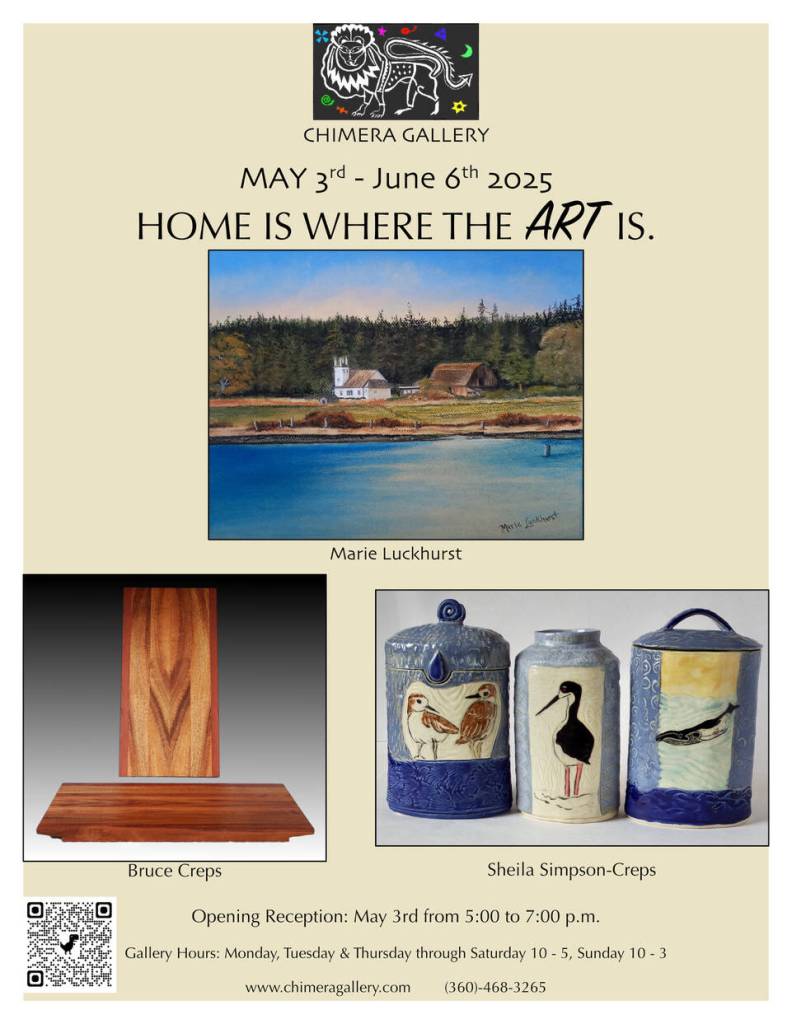 Saturday, May 3, from 5-7 p.m., Chimera Gallery invites you to an Opening Reception for “Home is Where the Art Is” featuring Marie Luckhurst, Bruce Creps and Sheila Simpson-Creps. The event will be held at Chimera Cooperative Gallery, Lopez Village Plaza. For more information, call 360-468-3265 or visit www.ChimeraGallery.com. May and June hours: Open Monday, Tuesday and Thursday through Saturday 10 a.m. to 5 p.m.; Sunday 10 a.m. to 3 p.m.