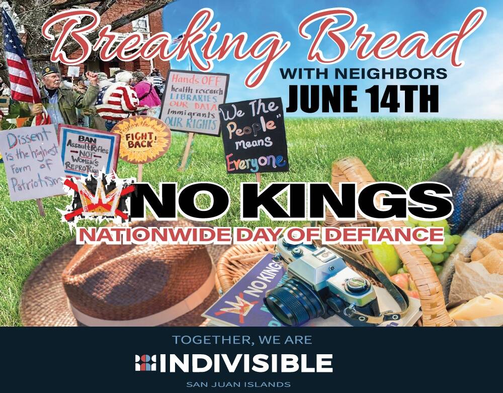 On San Juan Island, we’ll be breaking bread with our neighbors from noon to 2 p.m., at the Courthouse lawn, to symbolically and actually forge strong community bonds; presenting speakers from local organizations harmed by the current presidential administration’s policies and funding cuts; hosting local community organizations; and marching in protest.