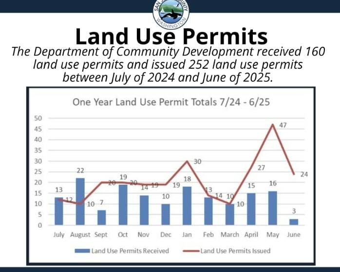 DCD received 75 land use permits in the first half of 2025 and issued 152 – more than double of what was received. Year to date (July 2024 – June 2025), the department has received 160 total land use permits and issued 252 permits. These types of permits include provisional use permits, ADU eligibility, shoreline exemptions and more. There are approximately 118 land use permits currently in process at various stages of review and may require additional applicant information, are routed for review or remain open.