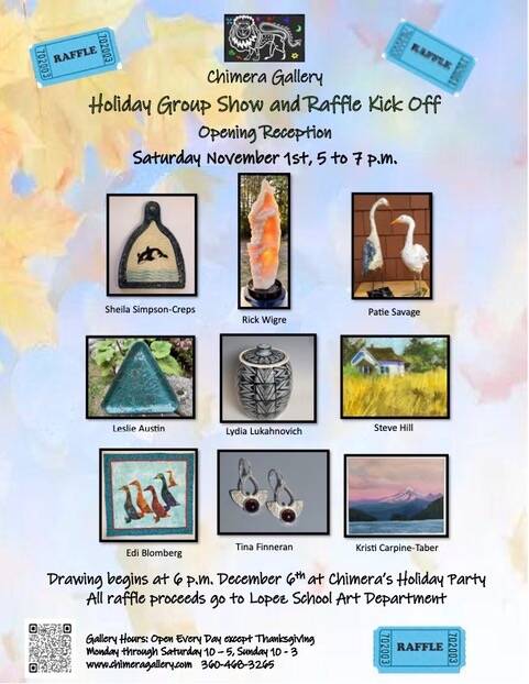 Saturday, Nov. 1, from 5-7 p.m., Chimera Gallery invites you to an Opening Reception for the annual Holiday Group Show and Raffle. We will start selling raffle tickets on Nov. 1 to support the Lopez Island Schools’ art programs. Chimera Cooperative Gallery is located at Lopez Village Plaza. Call 360-468-3265 or visit www.ChimeraGallery.com for more information. November hours: Open Monday, Tuesday and Thursday through Saturday, 10 a.m. to 5 p.m., and Sunday from 10 a.m. to 3 p.m.