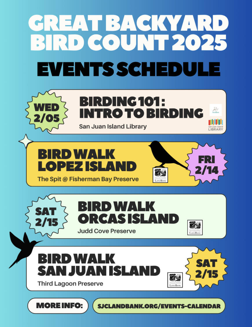 The San Juan County Conservation Land Bank, in conjunction with San Juan Islands Audubon and Lopez and San Juan Island Libraries, invites nature enthusiasts, birdwatchers and families to join in The Great Backyard Bird Count-themed activities this February. The GBBC — hosted in partnership with Cornell Lab, National Audubon Society and Birds Canada (Oiseaux Canada) — is a global citizen science event aimed at tracking bird populations and migration patterns. Whether new to birding or “fully fledged,” winter is a wonderful time to get outside and observe our feathered neighbors. Participate in the GBBC in your own backyard or join one of our Guided Bird Walks on a Land Bank Preserve.