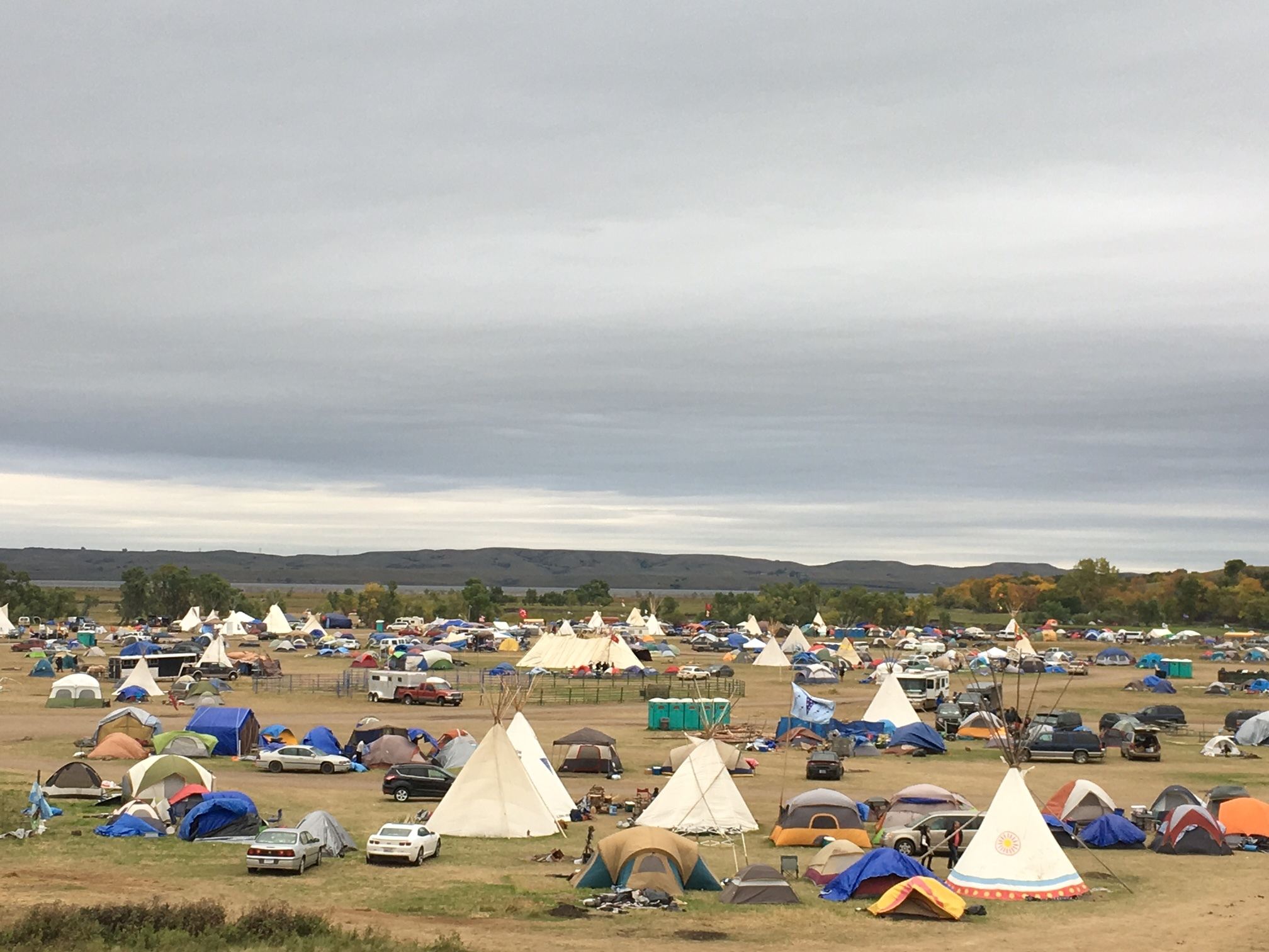 Tents, make-shift structures and tipis, some elaborately painted, are strewn across the brown undulating landscape. Golden cottonwoods blaze along the riverbeds. Hundreds of banners and flags snap in the prairie winds. Horses whinny, wood smoke rises. It feels both ancient and new.