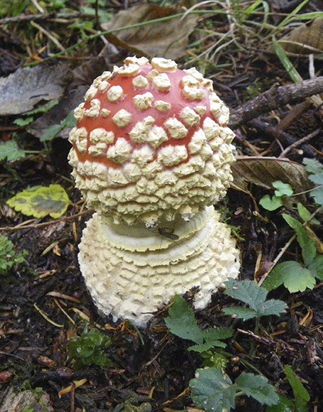 What we see above-ground as a mushroom is tiny compared to the mycelium, the actual body of the organism, a sheet or web of highly organized, cooperating fungal cells that may be buried underground, or inside a log. Mycelia can live for centuries and grow to acres in extent. On the occasions when they fruit, their microscopic spores dust the ground surface around them, and fill the air like pollen. Few spores become new mycelia, however. Most land where conditions are not quite right, or other competing fungi are already established.