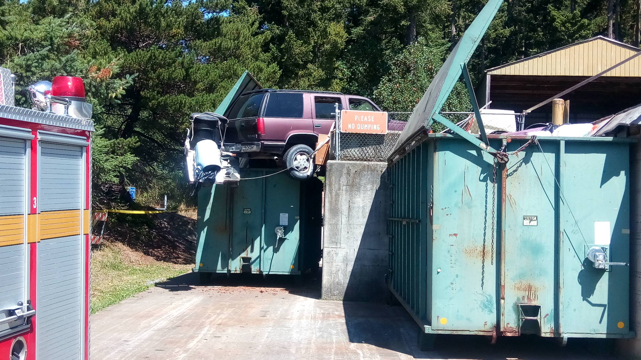 The vehicle was then dragged off the ledge the same way it went on. The whole ordeal closed the dump for 90 minutes.